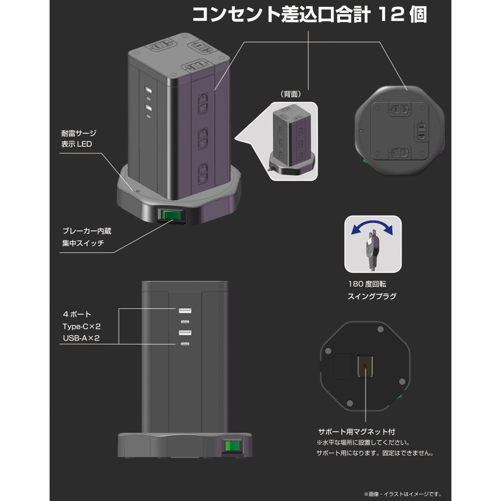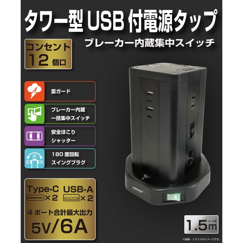商品名HIDISC タワー型USB付電源タップ (Type-C×2+Type-A×2)