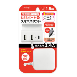 HIDISC ケーブル一体型充電器TypeC1ポート⁺USB 2ポート HDCAC01JXWH