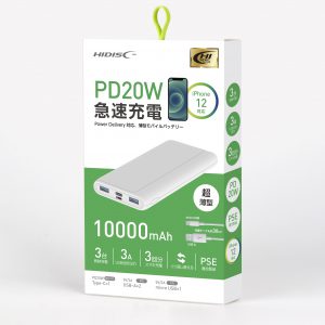 HIDISC PD20W, QC3.0対応 10000mAhモバイルバッテリー ホワイト HD-PD20W10000BTWH