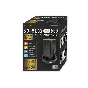 HIDISC タワー型USB付電源タップ (Type-C×2+Type-A×2)HD-AC12C2U2BK