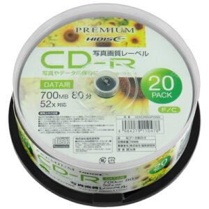 【高品質ハイグレードメディア】PREMIUM HIDISC CD-R データ用 700MB 52倍速 「写真画質レーベル」 ワイドエリア ホワイトプリンタブル スピンドルケース 20枚 2016年9月30日