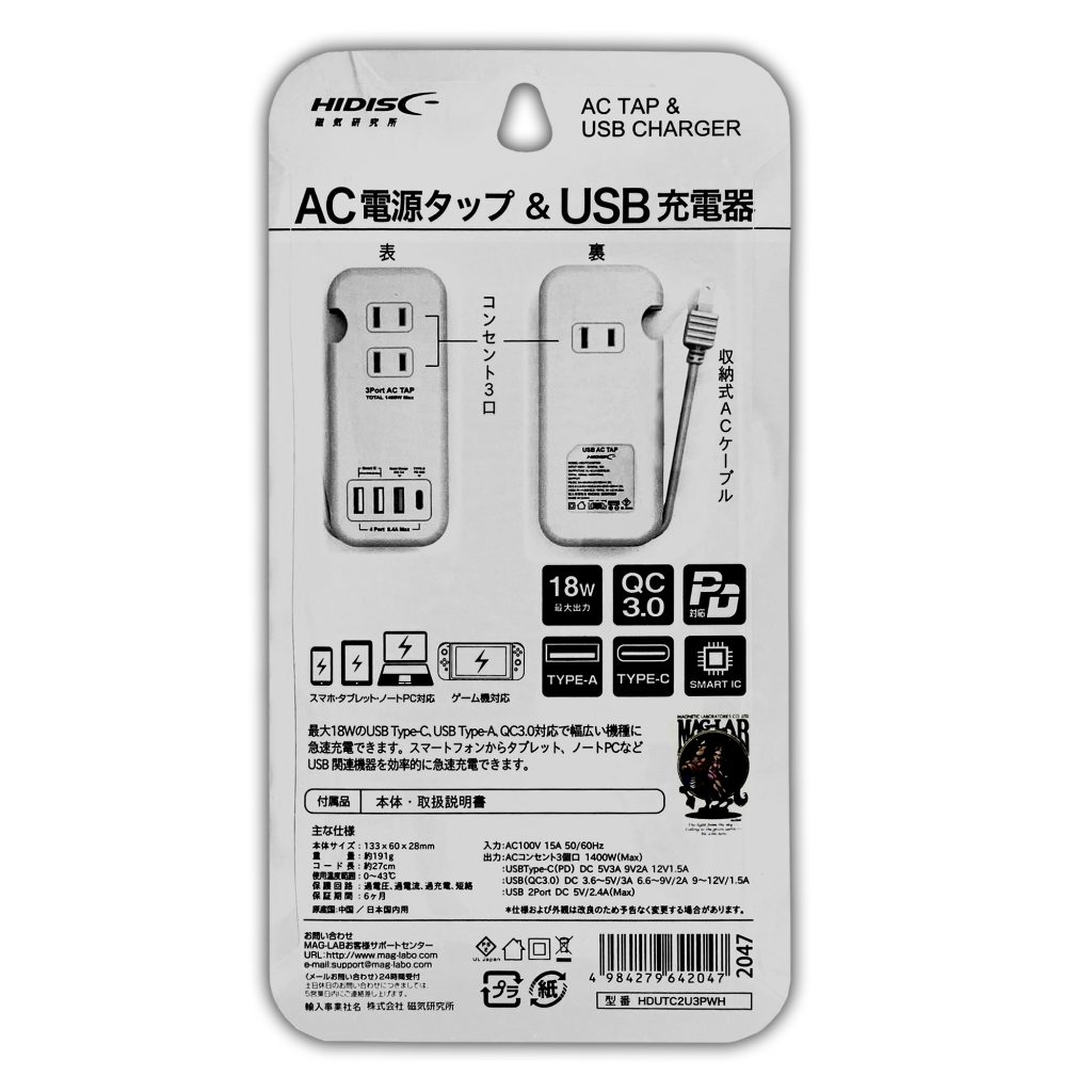 | 備考 | 日本国内用 入力:AC100V 50/60Hz 15A 出力:(ACコンセント3個口):AC100V 1400W/MAX 出力:(USB TYPE C): PD DC5V3A/9V2A/12V1.5A QC3.0:3.6~5V/3A 6.6̴~9V/2A 9̴̴̴~12V/1.5A USB2ポート合計出力:5V/2.4A(MAX) |