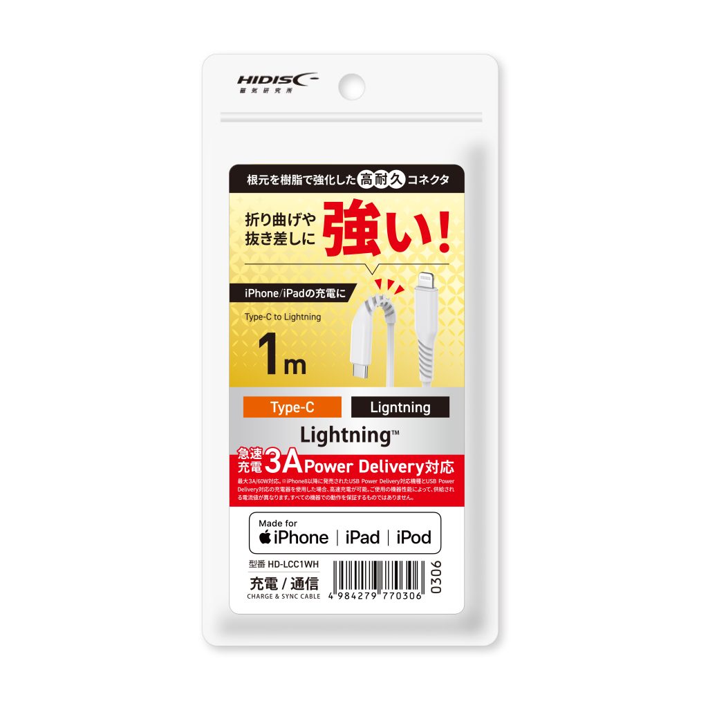 | 商品名 | HIDISC Type-C to Lightningケーブル 1m ホワイト 急速充電3A対応 折り曲げや抜き差しに強い! |