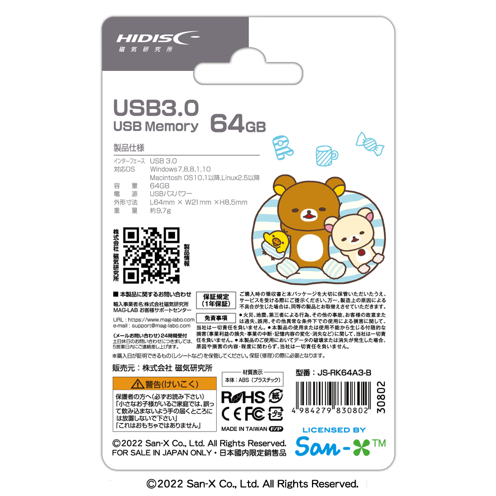 | 商品名 | HIDISC リラックマ USB 3.0 フラッシュドライブ 64GB 白 スライド式 JS-RK64A3-B |