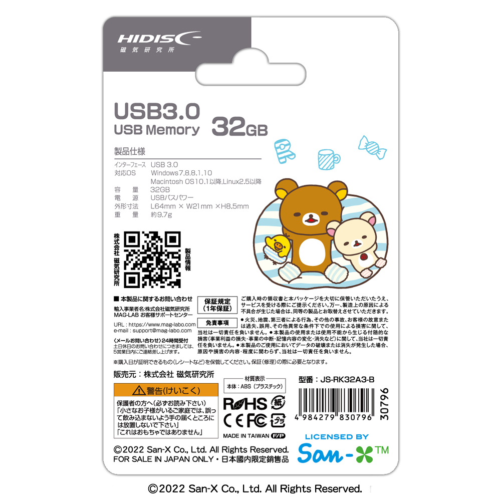 | 商品名 | HIDISC リラックマ USB 3.0 フラッシュドライブ 32GB 白 スライド式 JS-RK32A3-B |
