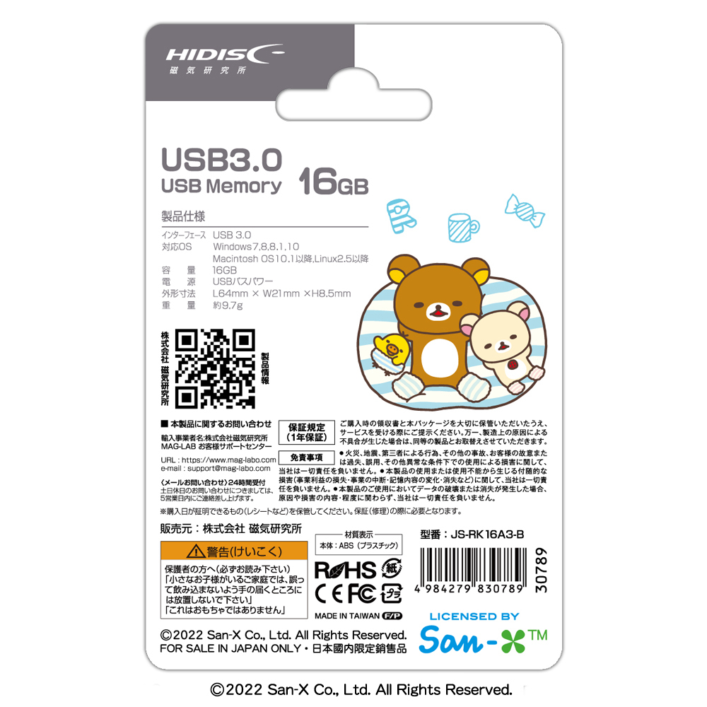 | 商品名 | HIDISC リラックマ USB 3.0 フラッシュドライブ 16GB 白 スライド式 JS-RK16A3-B |