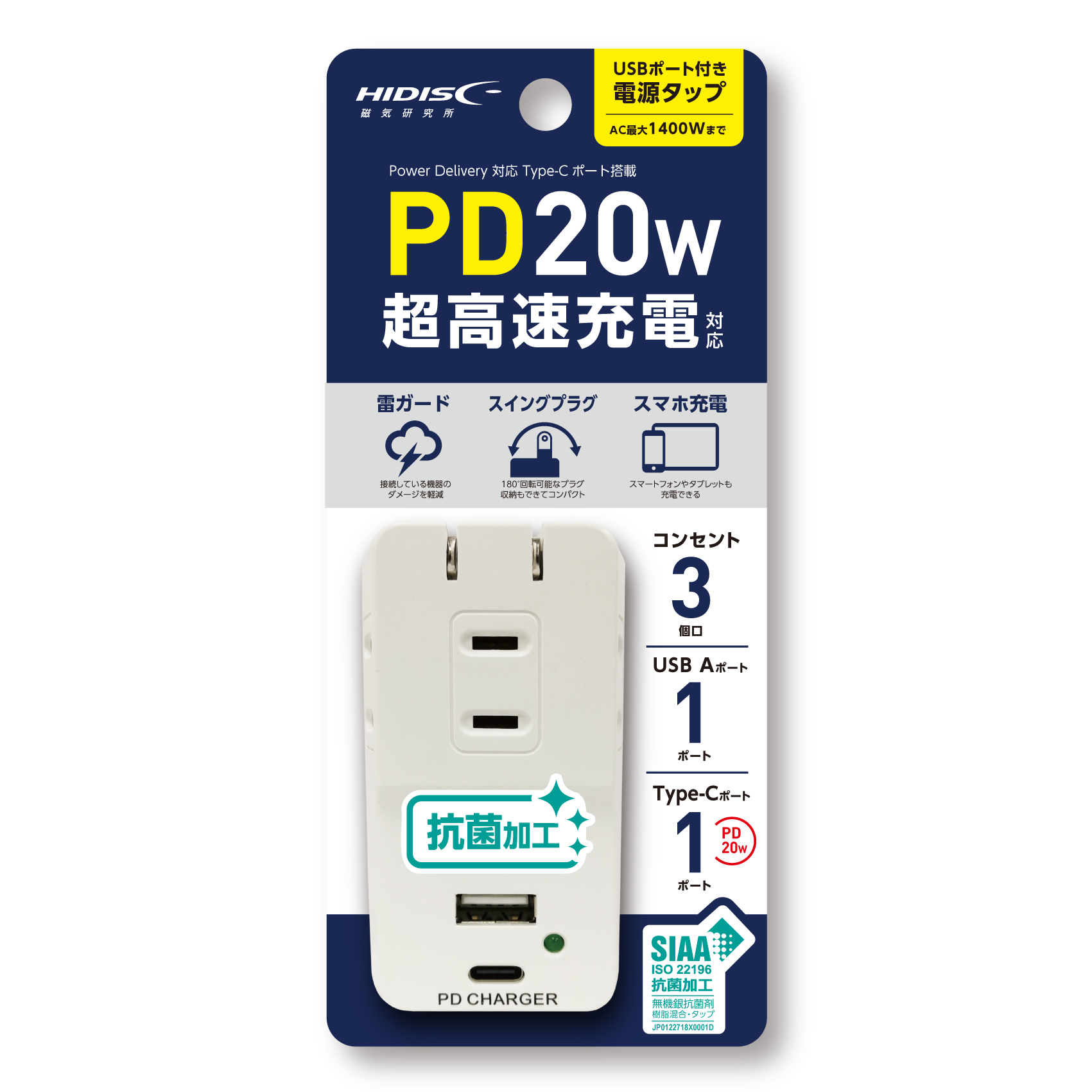 | 商品名 | HIDISC USBポート付抗菌電源タップ PD20W対応 |
