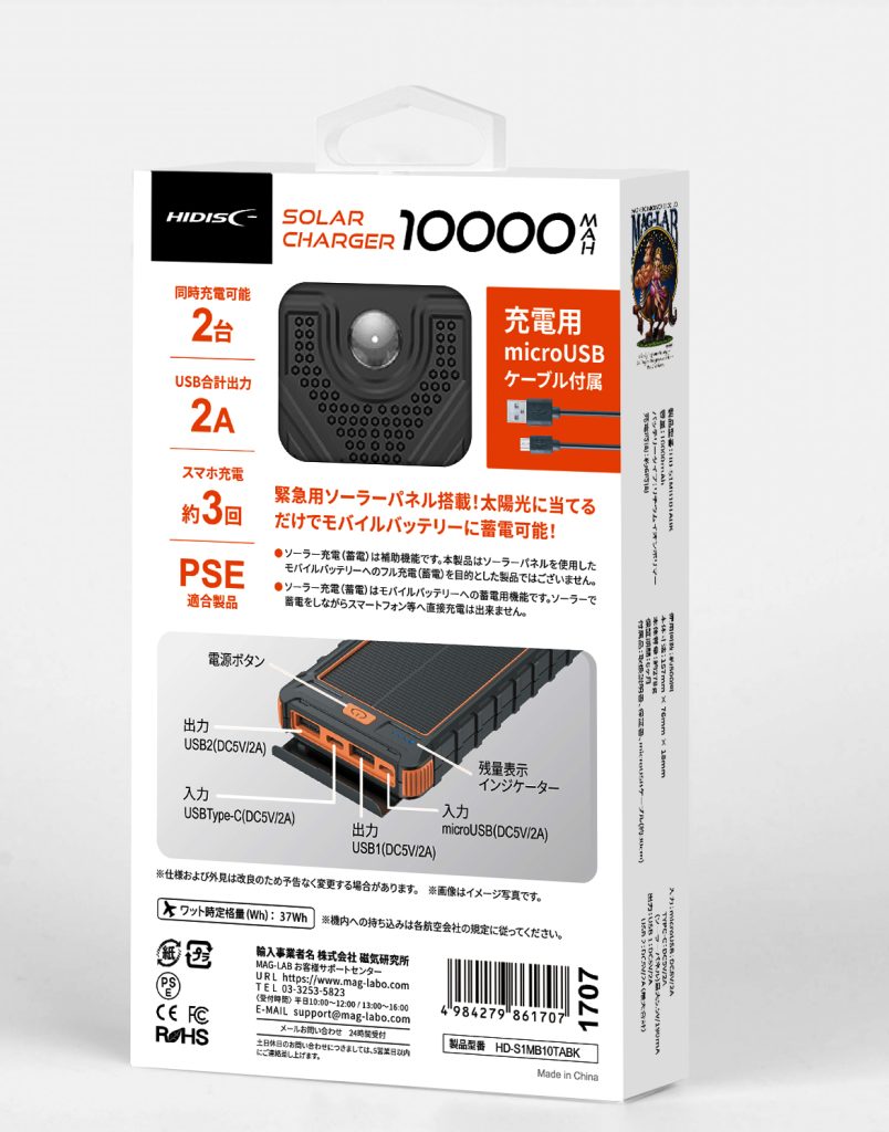 | 商品名 | HIDISC ソーラーパネルx1/LEDライト付き 10000mAh モバイルバッテリー |